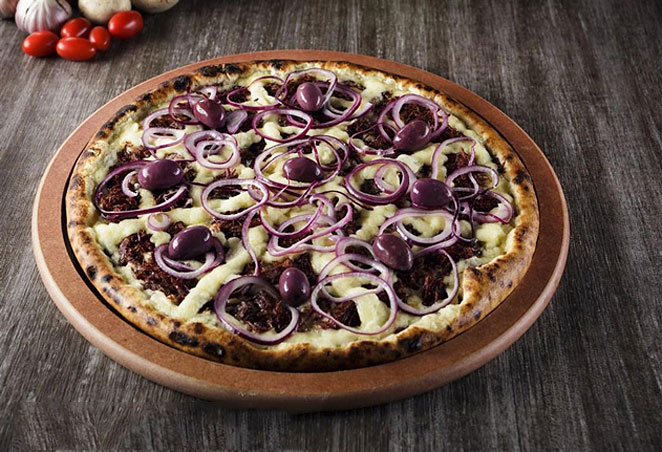 Azeite extra virgem, alho, queijo mozzarella, cebolas, cogumelos, azeitonas verdes, azeitonas pretas, tomates frescos.